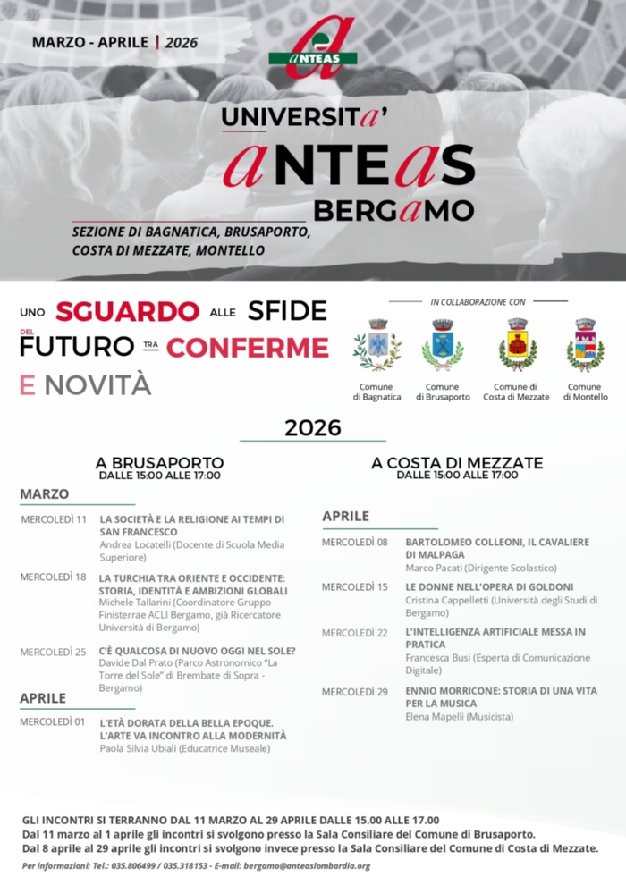 Anche quest’anno ANTEAS (Associazione Nazionale Tutte le Età Attive per la Solidarietà) insieme ai comuni di Bagnatica, Brusaporto, Costa di Mezzate e Montello propone una serie di incontri per l’aggiornamento culturale al fine di contribuire all’affermazione della cultura e alla diffusione di valori, di memorie, di esperienze di vita preziosi per la comunità.
