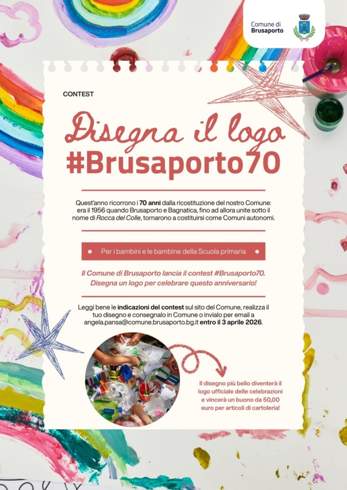 In occasione del 70° anniversario della ricostituzione del Comune di Brusaporto, l’Amministrazione comunale invita i bambini e le bambine residenti in paese e frequentanti la Scuola primaria a partecipare a un contest creativo per realizzare il logo ufficiale delle celebrazioni “#Brusaporto70”.