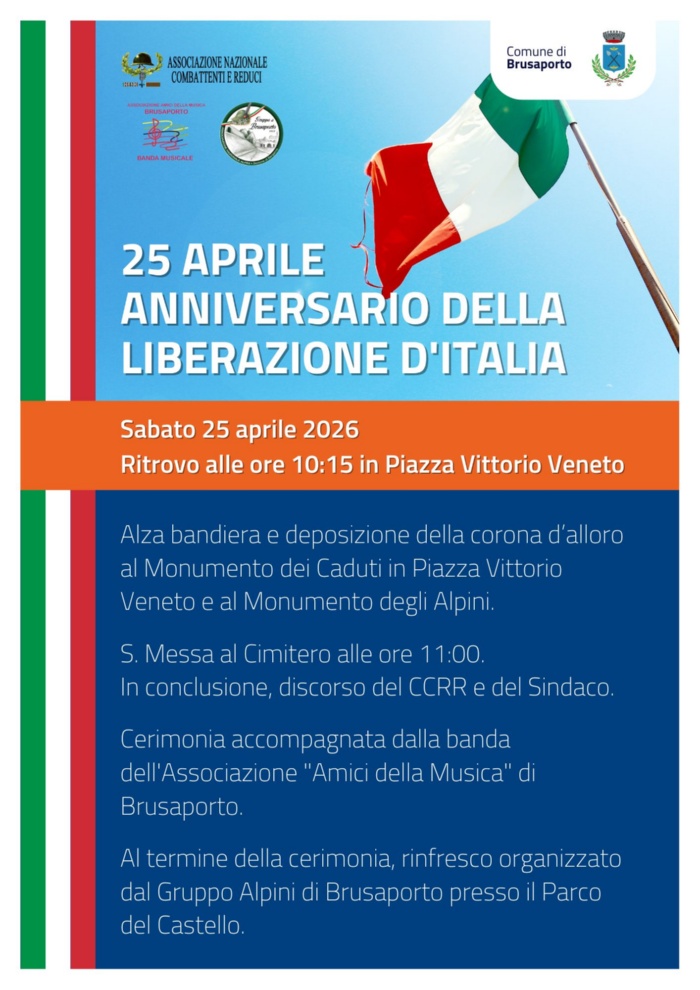 Il Comune di Brusaporto invita la cittadinanza a partecipare alle celebrazioni in occasione dell’Anniversario della Liberazione, momento di memoria e riflessione condivisa sui valori di libertà e democrazia.