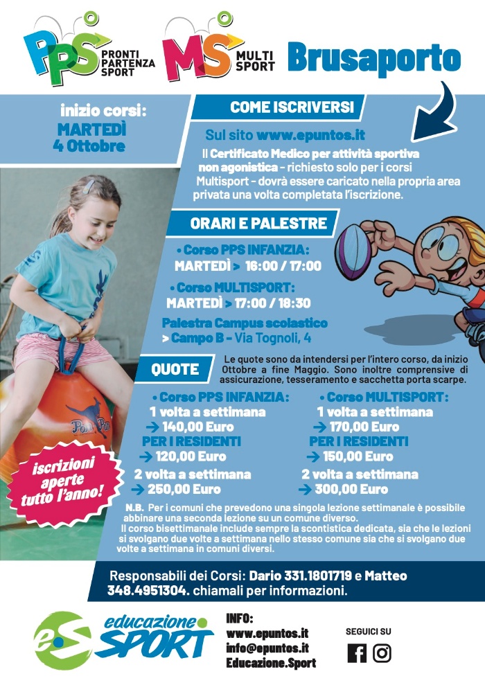 Siamo felicissimi di presentarvi anche per quest'anno la collaborazione tra il Comune di Brusaporto e Educazione.Sport per i corsi: