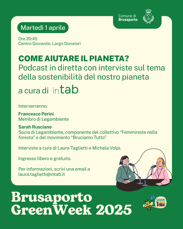 Il secondo appuntamento della “Brusaporto GreenWeek 2025” è un podcast ad accesso libero e gratuito, che si terrà in diretta con i ragazzi e le ragazze di inTAB - APS.