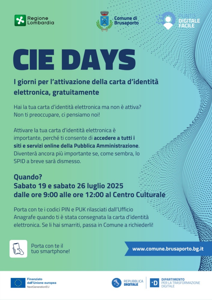 Per aiutare chi ancora deve procedere all’attivazione il Comune di Brusaporto in collaborazione con Regione Lombardia e Punto Digitale Facile organizza i “CIE Days” nelle giornate di sabato 19 e sabato 26 luglio 2025 dalle ore 9:00 alle ore 12:00 presso il Centro Culturale.