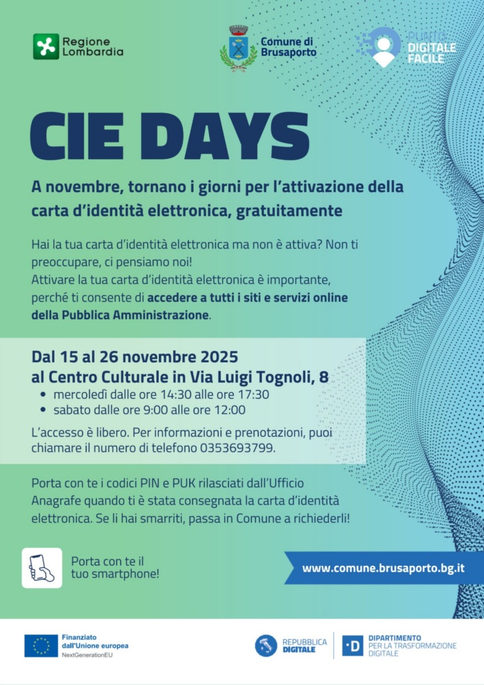 Per aiutare chi ancora deve procedere all’attivazione il Comune di Brusaporto in collaborazione con Regione Lombardia e Punto Digitale Facile organizza i “CIE Days” al Centro Culturale.