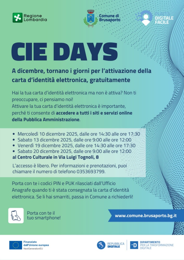 Per aiutare chi ancora deve procedere all’attivazione il Comune di Brusaporto in collaborazione con Regione Lombardia e Punto Digitale Facile organizza i “CIE Days” al Centro Culturale.