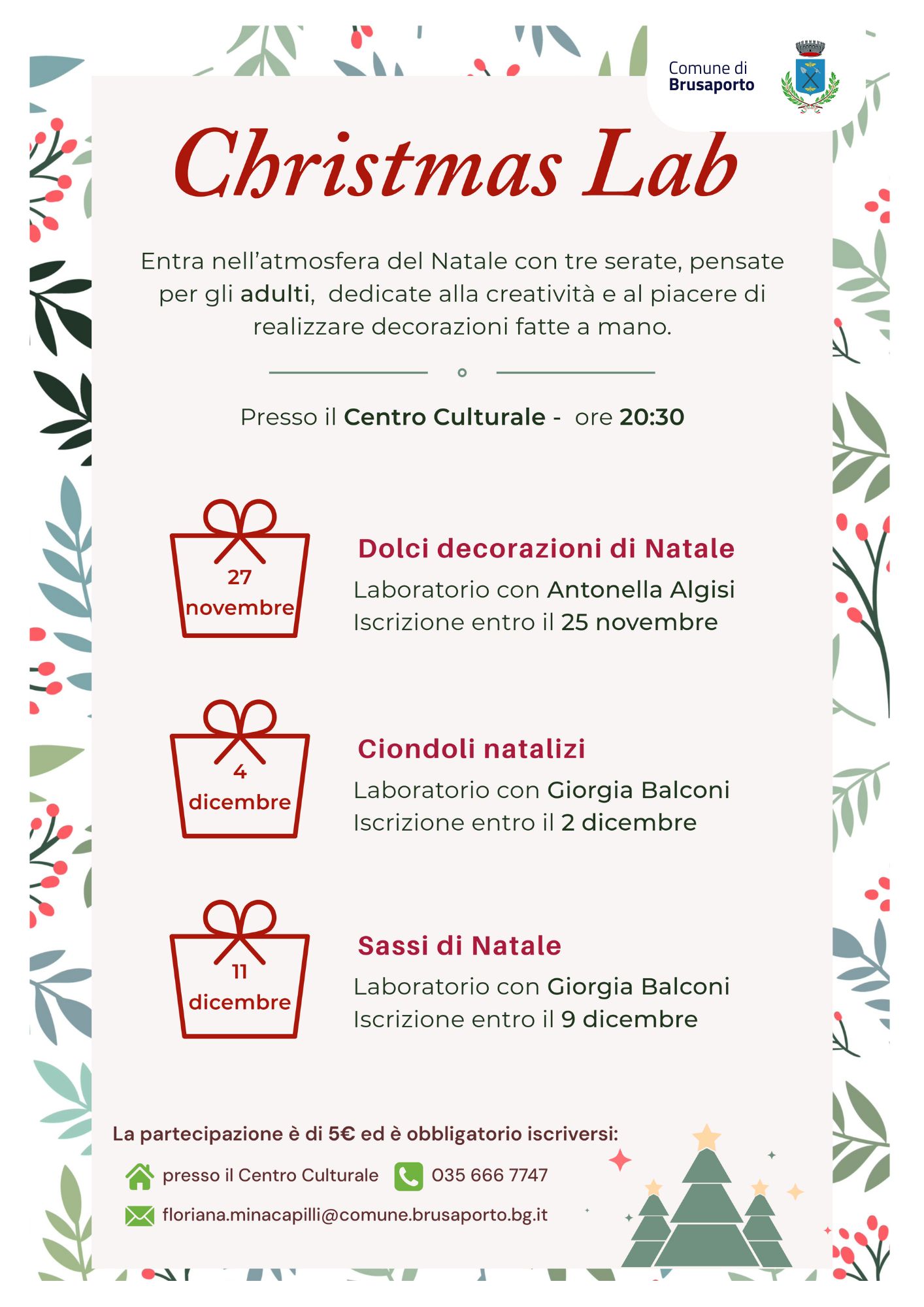 È necessaria la prenotazione presso il Centro Culturale o scrivendo una email a floriana.minacapilli@comune.brusaporto.bg.it.