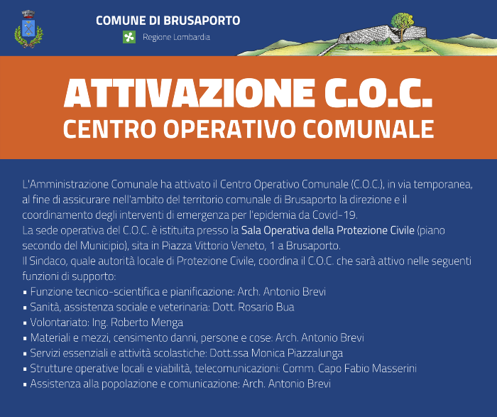 L'Amministrazione Comunale ha attivato il Centro Operativo Comunale (C.O.C.), in via temporanea, al fine di assicurare nell'ambito del territorio comunale di Brusaporto la direzione e il coordinamento degli interventi di emergenza per l'epidemia da Covid-19.