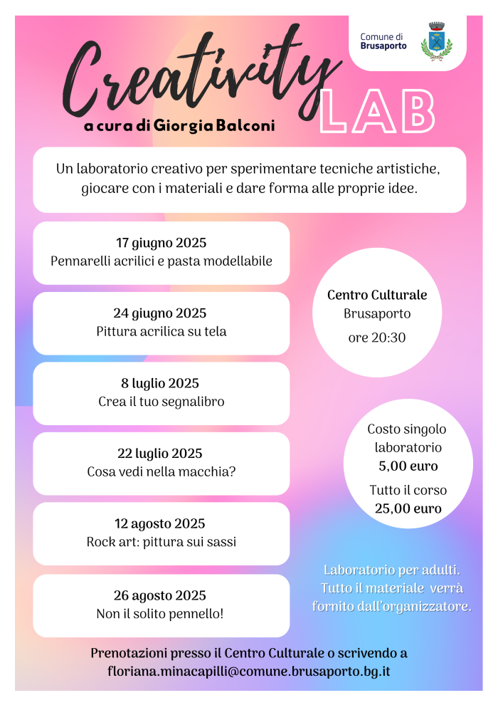 Un’occasione per staccare dalla routine, esprimerti liberamente e condividere l’esperienza con altre persone, tra colori, materiali e ispirazioni. Non servono competenze artistiche: basta la voglia di mettersi in gioco!