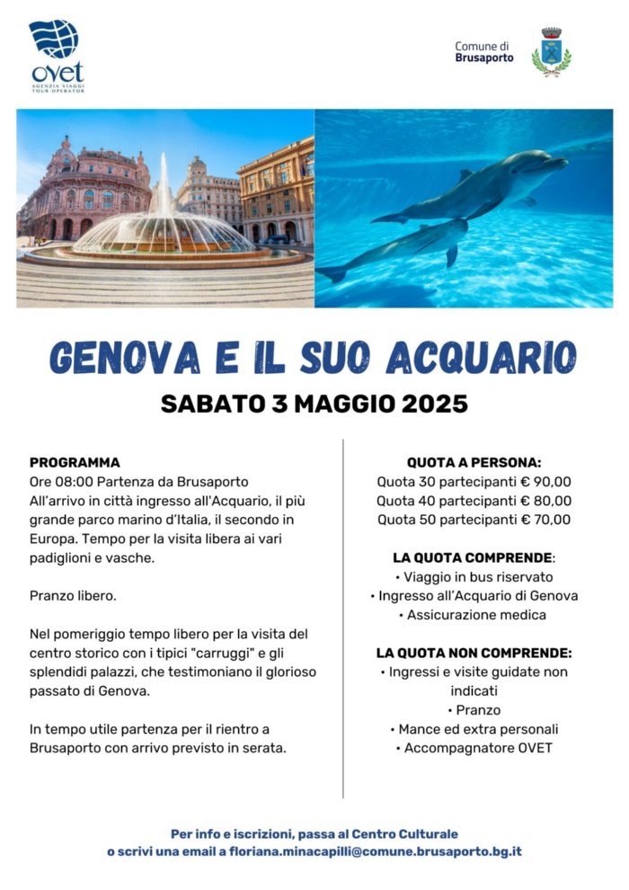 Il Comune di Brusaporto organizza per sabato 3 maggio 2025 una gita a Genova con visita all’Acquario.
