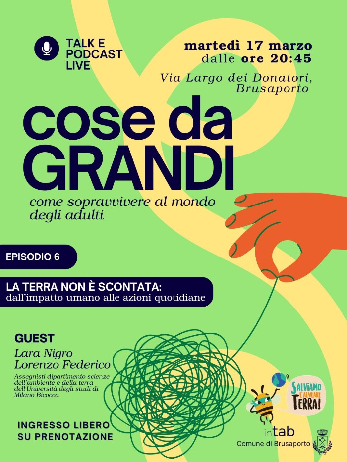 All'interno della Brusaporto GreenWeek 2026, l'associazione inTAB - APS di Brusaporto sta organizzando la seconda edizione di "Cose da grandi: come sopravvivere al mondo degli adulti". Si tratta di una serie di serate con talk e podcast live in cui i giovani condividono con i giovani le loro competenze.
