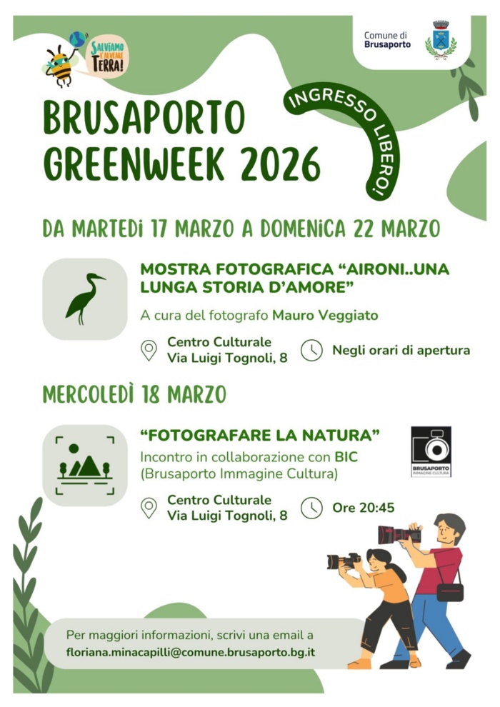 In occasione della Brusaporto GreenWeek 2026, mercoledì 18 marzo 2026 alle ore 20:45 è in programma l’incontro “Fotografare la natura”, realizzato in collaborazione con BIC – Brusaporto Immagine Cultura, dedicato alla fotografia naturalistica e alle tecniche per raccontare la natura attraverso le immagini.