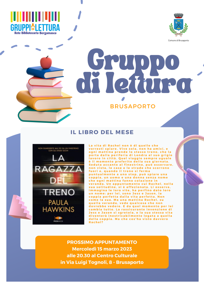 Il prossimo incontro sarà mercoledì 15 marzo alle 20.30 al Centro Culturale e leggeremo il libro "La ragazza del treno" di Paula Hawkins, se vuoi partecipare passa in Biblioteca a prenotare la tua copia!