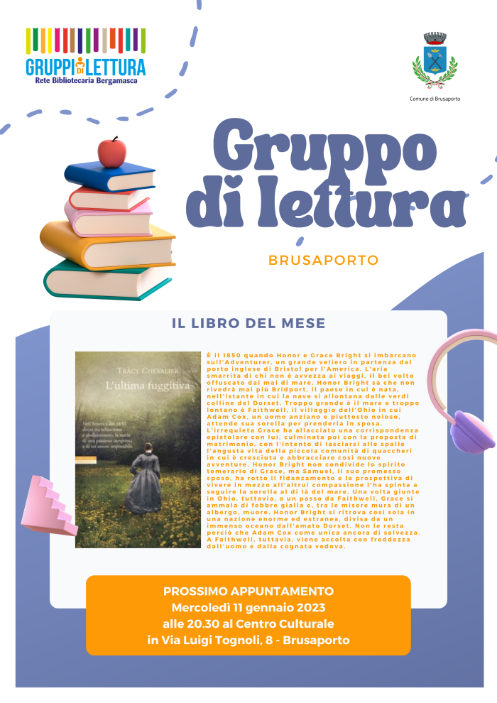 Il prossimo incontro sarà mercoledì 11 gennaio alle 20.30 al Centro Culturale e leggeremo il libro "L'ultima fuggitiva" di Tracy Chevalier, se vuoi partecipare passa in Biblioteca a prenotare la tua copia!
