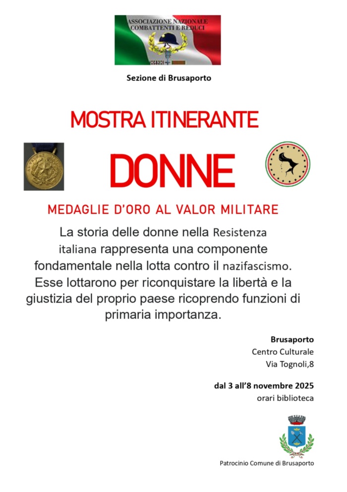 La sezione di Brusaporto dell’Associazione Nazionale Combattenti e Reduci porta a Brusaporto la mostra itinerante “Donne medaglie d’oro al valor militare”. L’appuntamento è la settimana dal 3 all’8 novembre 2025 presso il Centro Culturale.