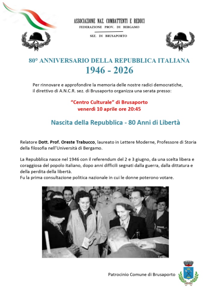 In occasione dell’80° anniversario della Repubblica Italiana, la sezione di Brusaporto dell’Associazione Nazionale Combattenti e Reduci organizza, con il patrocinio del Comune di Brusaporto, la serata “Nascita della Repubblica – 80 anni di Libertà”.