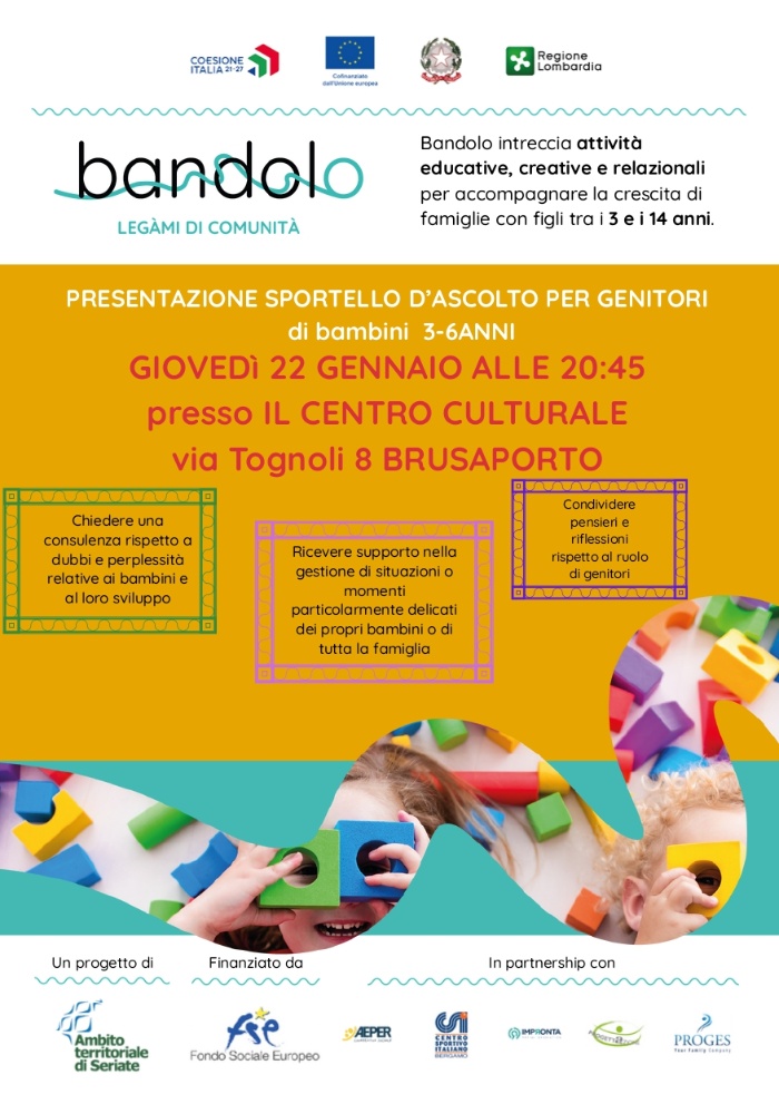 Il Comune di Brusaporto presenta il nuovo sportello di ascolto per le famiglie con figli dai 3 ai 6 anni. Lo sportello è uno spazio gratuito indicato per:
