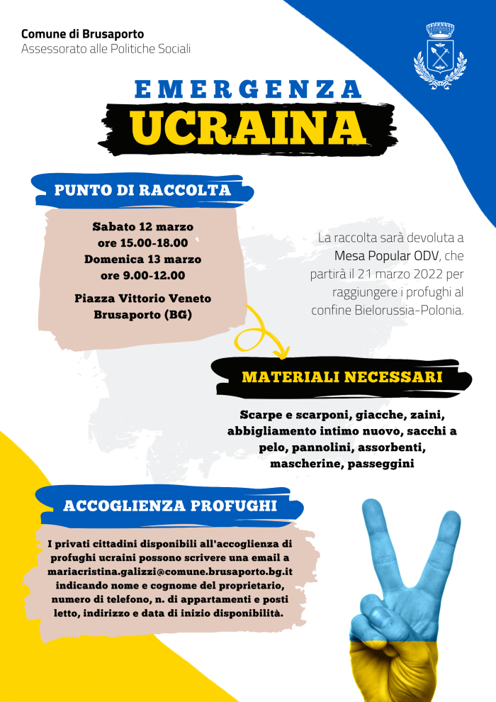 Il Comune di Brusaporto entra in campo per l'emergenza umanitaria del conflitto tra Russia e Ucraina, con una raccolta di materiali necessari ai profughi in fuga dalla guerra.