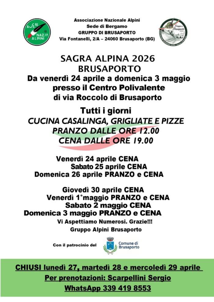 Torna la tradizionale Sagra Alpina di Brusaporto, un appuntamento imperdibile all’insegna della convivialità e della buona cucina! Vi aspettiamo da venerdì 24 aprile a domenica 3 maggio 2026 presso il Centro Polivalente di Via Roccolo.