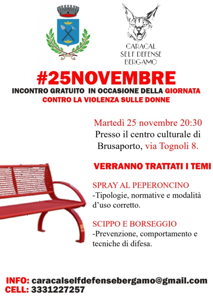 Martedì 25 novembre 2025 alle ore 20:30 presso il Centro Culturale, Caracal Self Defense Bergamo terrà una serata informativa gratuita in occasione della giornata contro la violenza sulle donne.