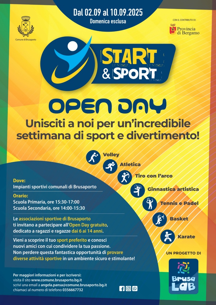 Anche per il 2025 ritorna "Start & Sport", l'open day sportivo che consentirà a tutti i bambini, le bambine, i ragazzi e le ragazze di sperimentarsi con le discipline sportive praticate a Brusaporto.