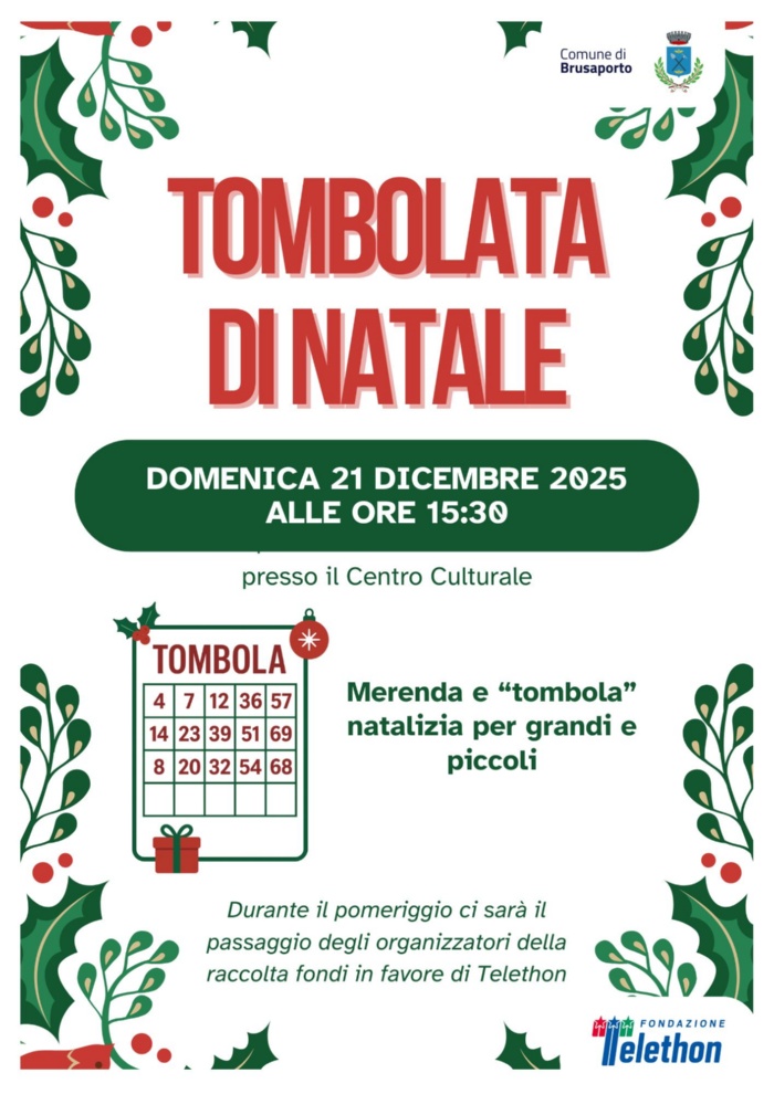 Domenica 21 dicembre 2025 nel pomeriggio è previsto il passaggio della staffetta per la raccolta fondi di Telethon. Il Comune di Brusaporto ha organizzato per l’occasione una merenda condivisa e una grande tombolata natalizia per grandi e piccoli in attesa dell’arrivo della staffetta.