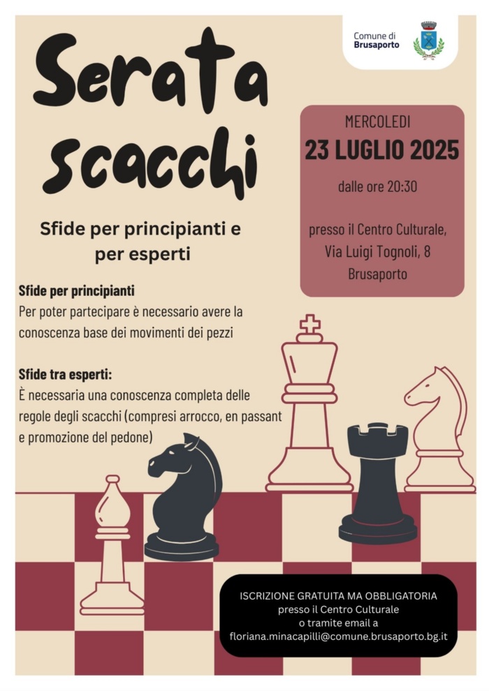 In continuità con il corso di scacchi organizzato in autunno, si propone a tutti gli appassionati di scacchi una serata in compagnia presso il Centro Culturale mercoledì 23 luglio 2025 dalle ore 20:30. Ci saranno sfide tra principianti e tra esperti.