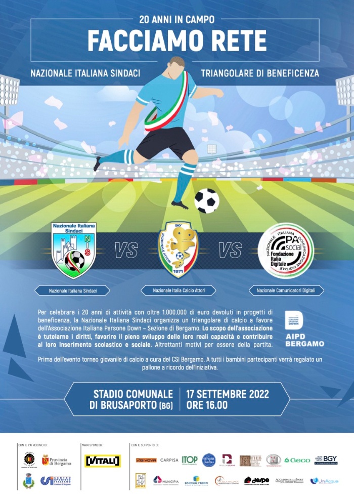La Nazionale Italiana Sindaci arriva a Brusaporto! Sabato 17 settembre 2022 alle ore 16.00 presso il Centro Sportivo di Brusaporto.