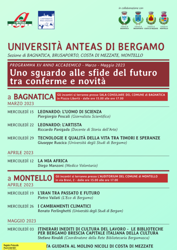 Ripartono i corsi dell'Università della Terza Età, organizzati dai comuni di Brusaporto, Bagnatica, Costa di Mezzate e Montello in collaborazione con ANTEAS. Le iscrizioni sono aperte, scopri tutte le informazioni nel volantino.