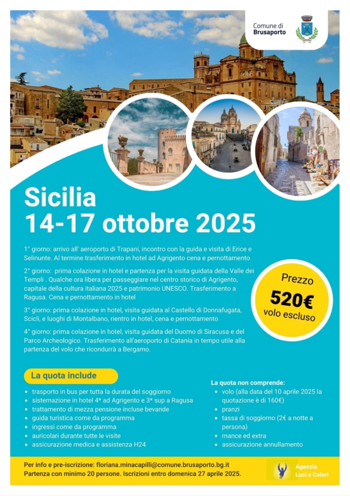 Il Comune di Brusaporto organizza una gita di quattro giorni in Sicilia, dal 14 al 17 ottobre 2025 in occasione di "Agrigento Capitale della Cultura 2025".