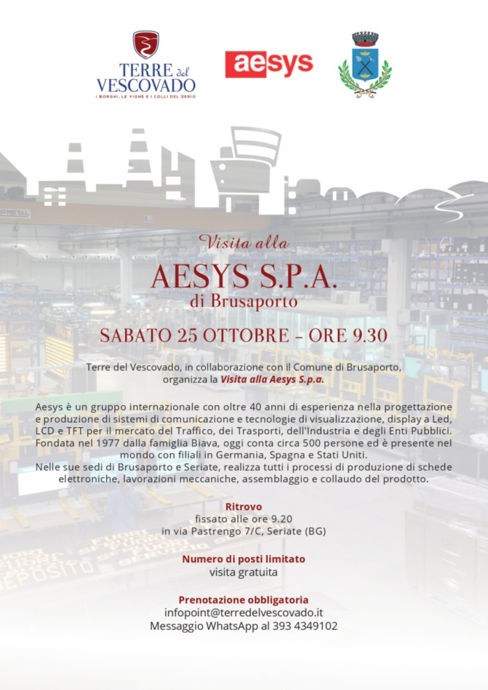 Terre del Vescovado, in collaborazione con il Comune di Brusaporto, organizza una visita alla Aesys spa, un’importante realtà industriale del territorio.