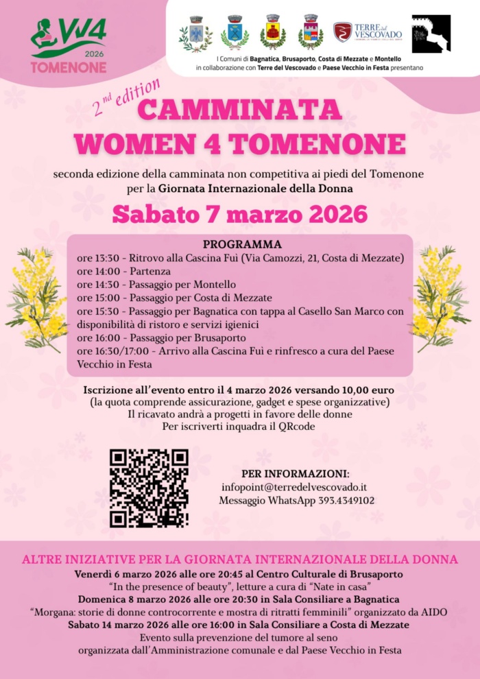 In occasione della Giornata internazionale della donna, sabato 7 marzo 2026 si terrà la seconda edizione di Women4Tomenone, la camminata non competitiva organizzata dai comuni di Brusaporto, Bagnatica, Costa di Mezzate e Montello in collaborazione con Paese Vecchio in Festa e Terre del Vescovado.